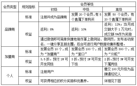 品牌通六贵福利商城会员分为三种类型:品牌商会员;加盟商会员;个人会员。每种会员的用户等级均分为:初级、中级、高级三种。