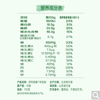 商品名称:伊利倍畅 羊奶粉 无蔗糖 欧洲进口奶源 纯羊乳 益生菌 高钙 多种维生素 营养均衡 700g罐装