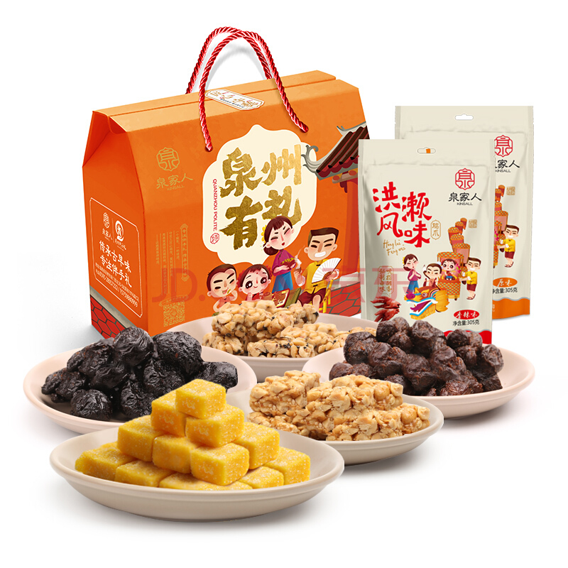 商品名称:泉家人 零食大礼包蜜饯果脯果干办公室休闲食品话梅洪濑鸡爪麻粩芒果干福建特产伴手礼盒 事事如意2395g