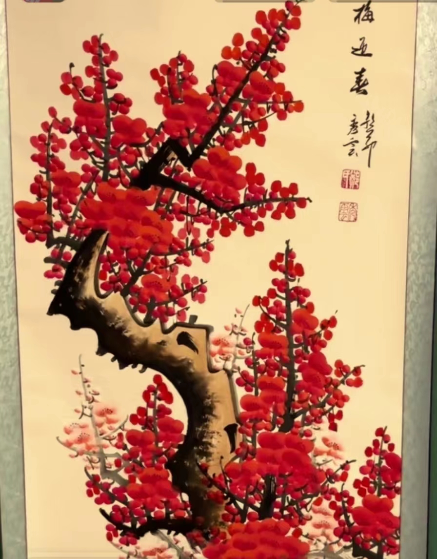 名家名画/红梅迎春/竖小六尺软轴锦绫装裱