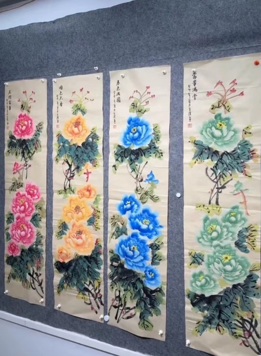 有着国色天香之貌、富贵吉祥之意的牡丹,是历代国画家们的座上宾,以牡丹入画,为了使作品寓意更加丰富,意境更加优美,往往会加入一些其它元素,如富贵牡丹四条屏,有着与富贵结合在一起的不同寓意,将其挂在客厅里,带来的不仅仅是艺术之美,还为家庭增福纳瑞。