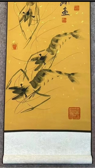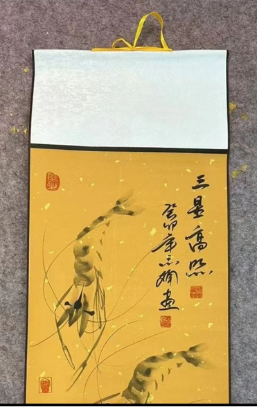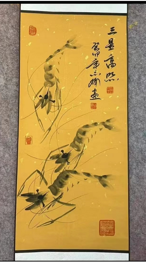 名家名画/三星高照(三虾图)/竖三尺软轴装裱